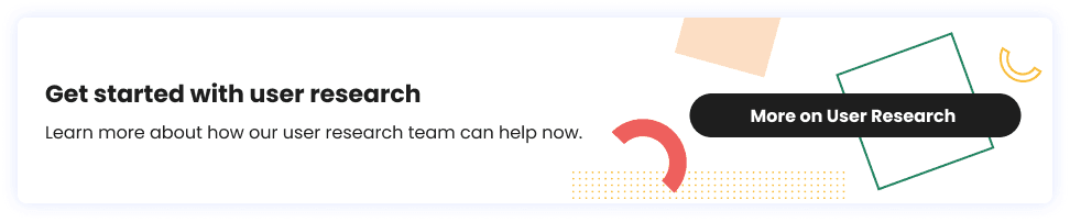There you have it. 12 solid user research techniques that can boost the outcomes of your user research. One final piece of advice from us. Choose your methods wisely. With these techniques, it’s all about quality, not quantity. Don’t overload yourself with too many methods that become unmanageable. Remember, you still have to do all your analysis. Pick your battles. Choose qualitative techniques that give you a robust perspective and statistically back your findings with quantitative methods. If you have any questions about research or want to hear more from our user experience and research team, you can reach out to us. We can help you build a research approach that has strong roots in strategy and are well aligned with what your product needs.