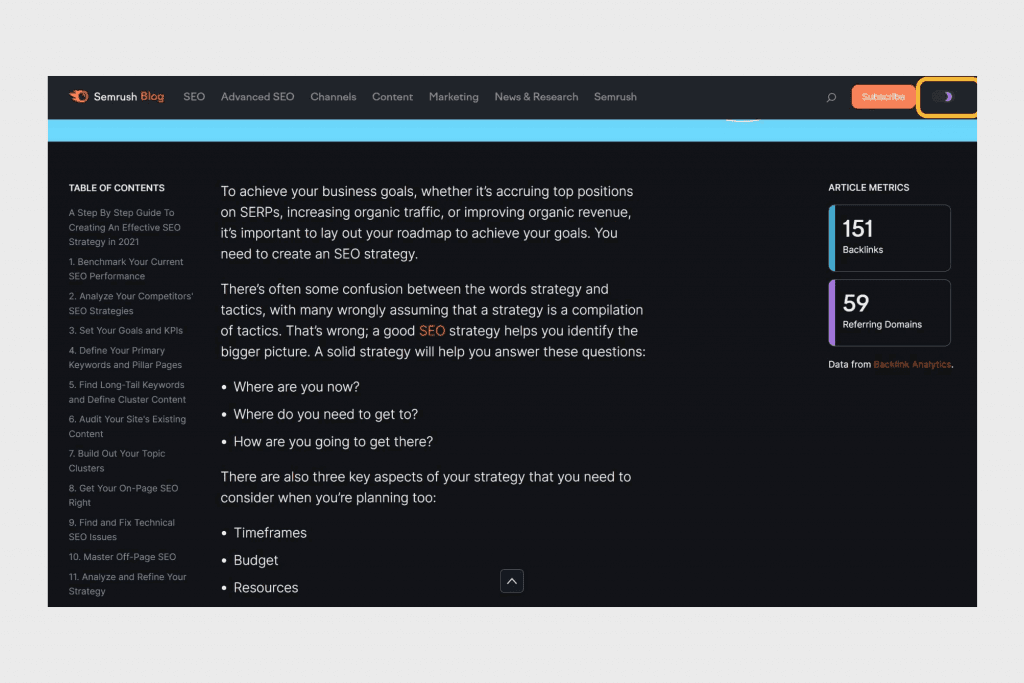 A great example of dark mode integration comes from the content marketing tool SEMrush. They have cut out the need for 3rd party apps and made it extremely easy for the user to opt for their preferences.
